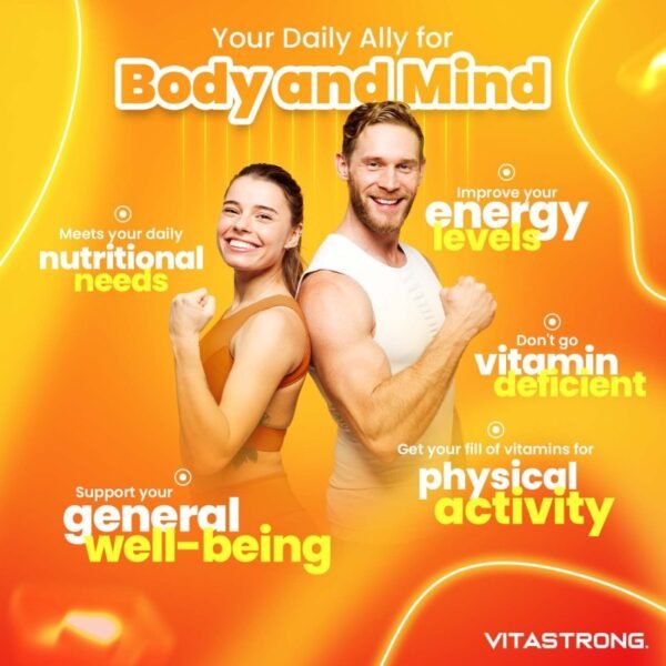VitaStrong Multivitamin is an essential multivitamin supplement for all athletes, combining several essential vitamins for physical and mental well-being. We have created a formula that we like, truly strong, effective, and natural, to help you integrate all the vitamins your body needs!