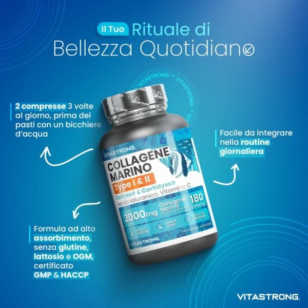 Vitastrong Marine Collagen is a premium supplement with 2000 mg of marine collagen per dose, combined with hyaluronic acid and vitamin C to maximize benefits. Formulated with certified raw materials such as Collys® and Cartidyss®, it is designed to support skin, joints and connective tissues, ensuring optimal absorption and visible results in a short time.